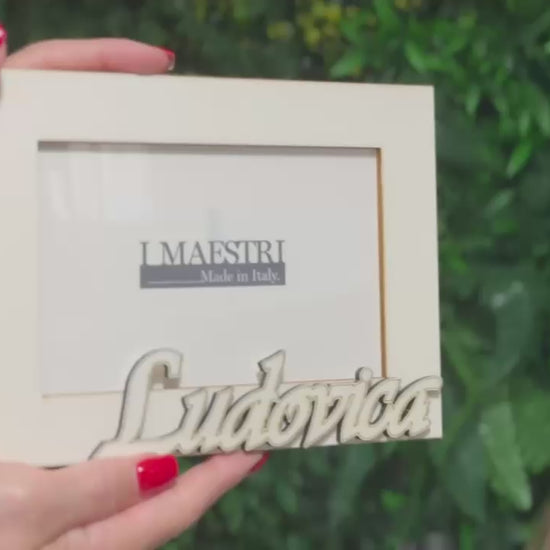 Cornice portafoto personalizzabile con nome, parola a scelta intagliata sul fronte. Possibilità di aggiungere una dedica incisa sul retro;